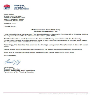 中國神華自籌備沃特馬克項目以來,針對沃特馬克礦區內的各類文化遺跡,中國神華澳洲公司根據聯邦和新州兩級政府的環評批復為磨刀石、疤痕樹等土著遺跡制訂了妥善的保護和遷移措施,編制了全面的《遺跡管理計劃》,2020年3月經新州政府正式批準正式實施。《遺跡管理計劃》在編制過程中廣泛聽取了當地原住民組織的反饋意見,獲得了大多數原住民的認可和支持。